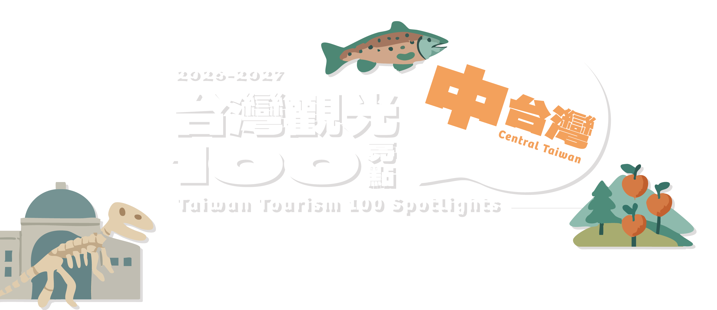 苗栗縣Miaoli County 臺中市Taichung City 彰化縣Changhua County 南投縣Nantou County 雲林縣Yunlin County 嘉義縣Chiayi County 嘉義市Chiayi City 雪霸國家公園臺灣櫻花鉤吻鮭生態中心 Taiwan Salmon Eco Center, Shei-PaNational Park 福壽山農場 Fushoushan Farm 清境農場 Qingjing Farm 谷關遊客中心暨入關博物館 Guguan Visitor Center(Guguan Museum) 八仙山國家森林遊樂區 Basianshan National Forest Recreation Area 觀霧遊憩區 Guanwu Recreation Area 南庄老街 Nanzhuang Old Street 白沙屯拱天宮 Baishatun Gongtian Temple 雪見遊憩區 Xuejian Recreation Area 苗栗出磺坑礦業文化景觀 The Cultural Landscape of Miaoli Chuhuangkeng Mining Industrial sites 舊山線鐵道自行車 Old Mountain Line Rail Bike 寶熊漁樂碼頭 Okuma Center 國立自然科學博物館 National Museum of Natural Science 霧峰林家宮保第園區 Wufeng Lin Family Mansion and Garden 鹿港老街 Lukang Old Street 雲林溪藝文廊帶 Yunlin Riverside Cultural Boulevard 金湖休閒農業區 Jinhu Leisure Agricultural Area 日月潭月牙灣 Sun Moon Lake 溪頭 Xitou 車埕 Checheng 餅乾學院 School of Cookie 臺灣客家文化館 Taiwan Hakka Museum 武陵農場 Wuling Farm 自行車文化探索館 Cycling Culture Museum 臺灣玻璃館 Taiwan Glass Gallery 澎湖縣Penghu County 連江縣Lienchiang County 金門縣Kinmen County