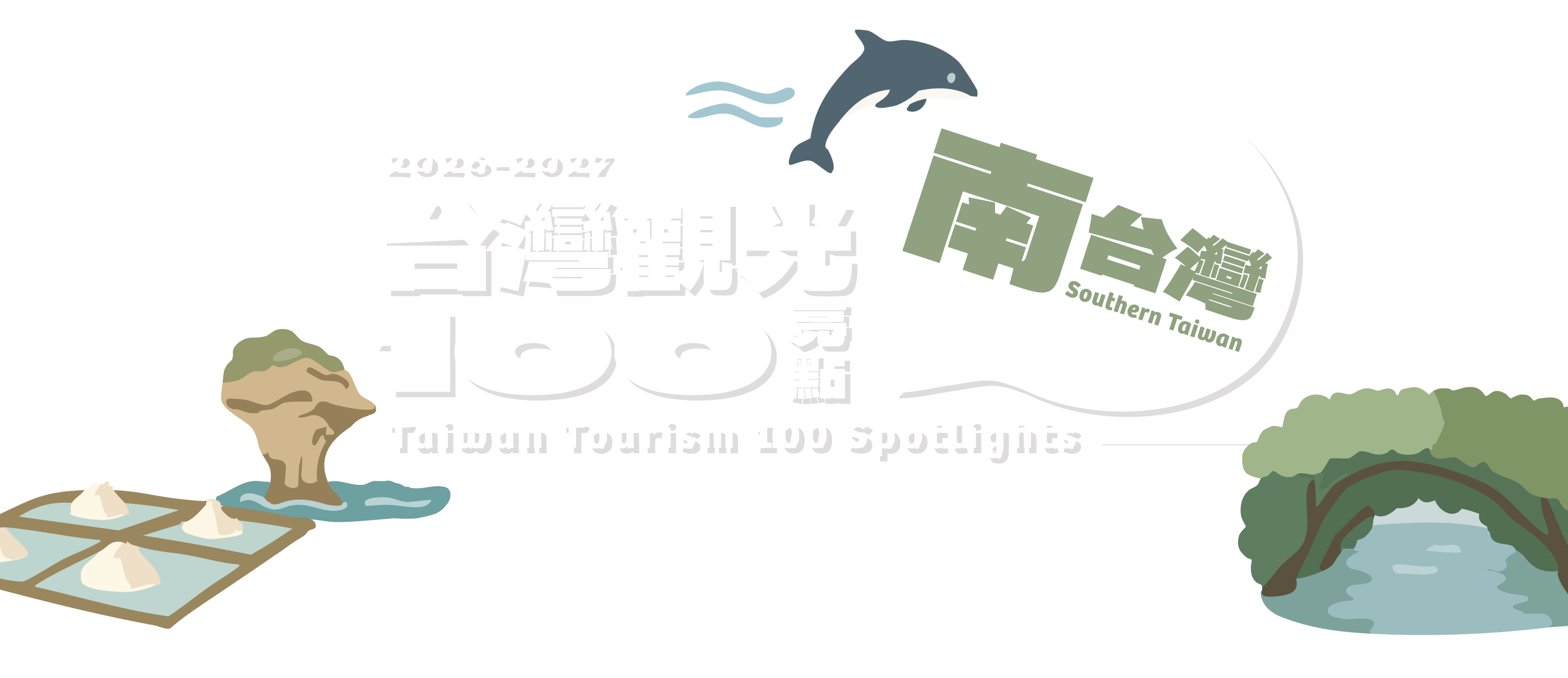 臺東縣Taitung County 嘉義縣Chiayi County 嘉義市Chiayi City 臺南市Tainan City 高雄市Kaohsiung City 屏東縣Pingtung County 奮起湖及其步道群 Fenqihu and its Trails 二延平步道 Eryanping Trail 四草綠色隧道 Sicao Green Tunnel 霧臺神山部落 Shenshan Tribe, Wutai Township, Pingtung County 鵬灣跨海大橋 Dapeng Bay Bridge 國立海洋生物博物館 National Museum of Marine Biology and Aquarium 墾丁國家公園龍磐公園 Longpan Park, Kenting National Park 小琉球花瓶岩 Flower Vase Rock 大港橋愛河灣 Great Harbor Bridge at Love River Bay 泗溝水聚落 Sihgoushuei Settlement 六堆客家文化園區 Liugdui Hakka Cultural Park 屏菸1936文化基地 Pingtung 1936 Tobacco Cultural Base 勝利星村創意生活園區 History of Victorystar in Pingtung (V.I.P. Zone) 衛武營國家藝術文化中心 National Kaohsiung Center for the Arts (Weiwuying) 國立科學工藝博物館 National Science and Technology Museum 曾文水庫漂流木提琴村 Zengwen Reservoir Driftwood Violin Village 仙湖休閒農場 Senwho Farm 阿里山林業暨鐵道 Alishan Forest Railway 關子嶺溫泉風景區 Guanziling Hot Spring 井仔腳瓦盤鹽田 Jingzaijiao Tile-paved Salt Fields 嘉義市立美術館 Chiayi Art Museum 蓮池潭龍虎塔 Dragon Tiger Tower 壽山動物園 Shoushan Zoo 高雄燈塔 Kaohsiung Lighthouse 紅頂穀創穀物文創樂園 Red Barn Factory & Tours