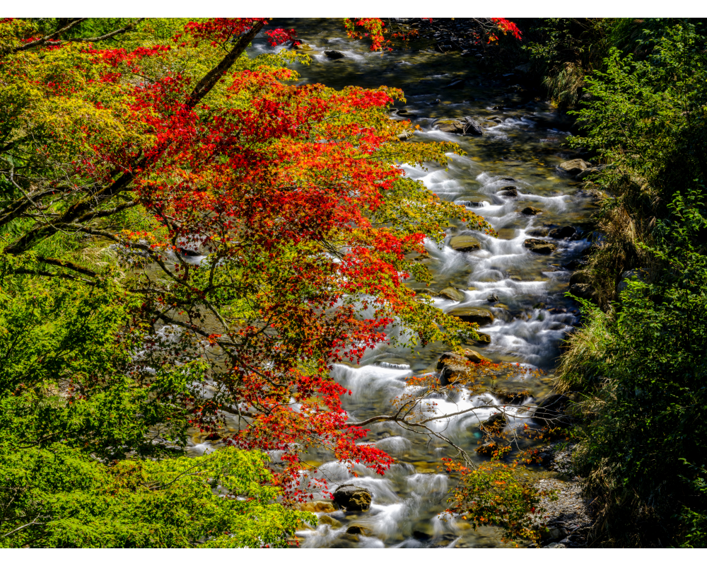 上帝的視角,七家灣溪畔楓紅、銀杏轉色,像是上帝打翻的調色盤